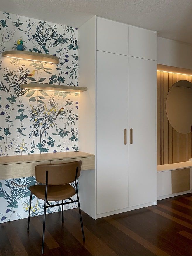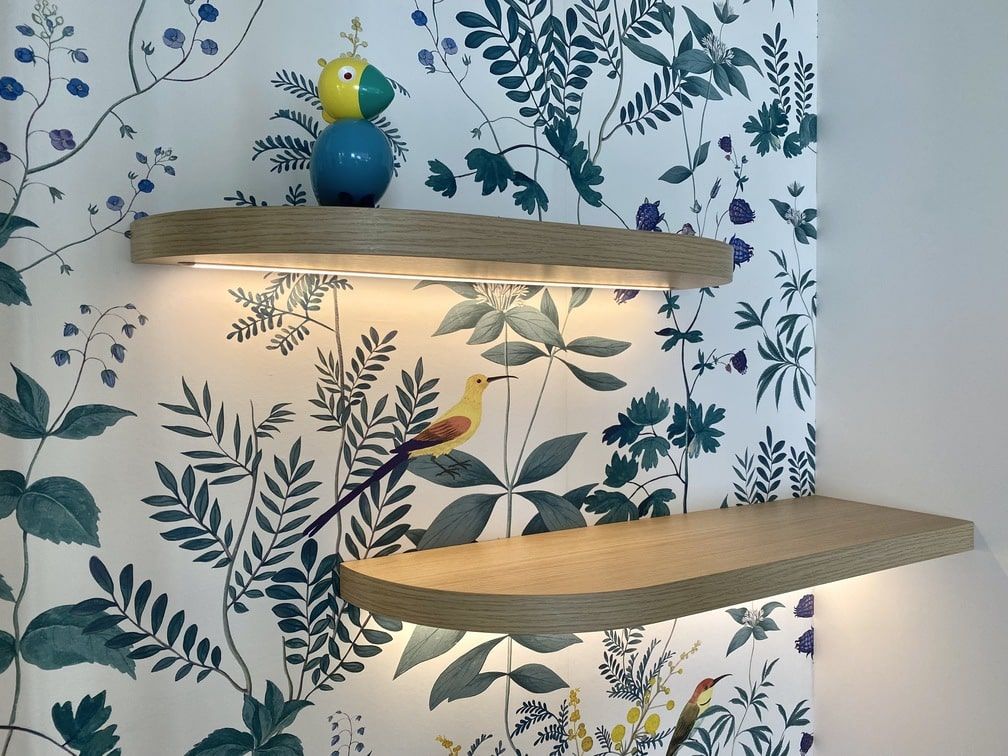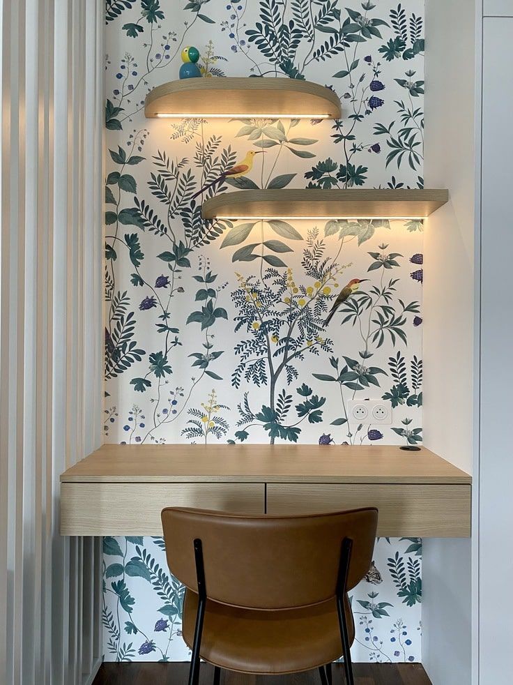 Le papier-peint frais et coloré a été subtilement sélectionné et le projet viendra se finaliser prochainement par la création sur mesure d’un joli coussin d’assise pour la banquette.