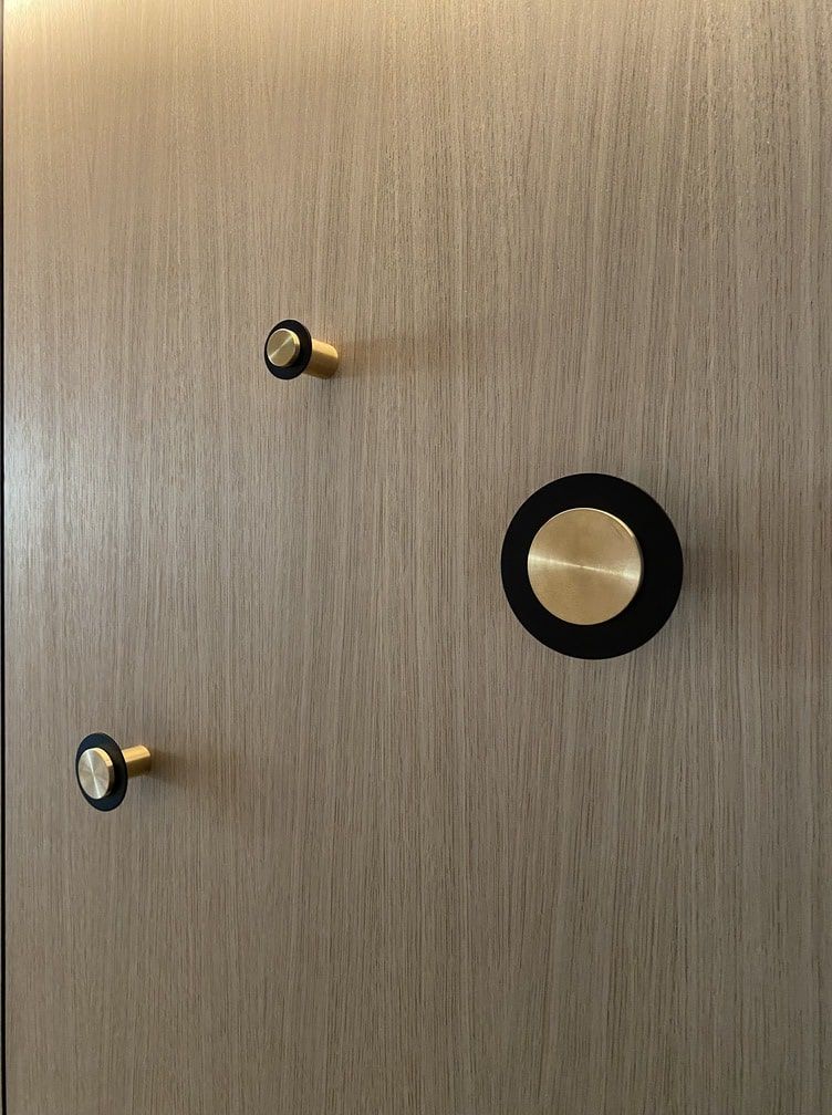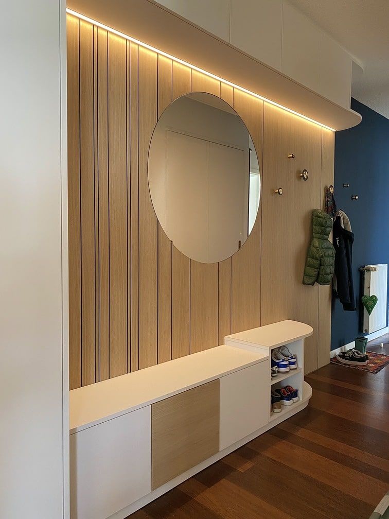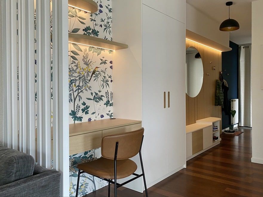 Il s'agissait de rendre l'entrée de cet appartement fonctionnelle pour toute la famille. Étroite et dépourvue de lumière naturelle directe, le challenge du projet résidait dans le fait d’y intégrer un espace de travail lié à un rangement de penderie généreux, quelques patères, une banquette peu profonde mais confortable, de nombreux casiers de rangement pour les chaussures et autres objets du quotidien ainsi qu’un plateau « vide-poche ». Le tout sans encombrer le volume et préserver une circulation fluide et agréable. Le complexe a été pensé en élégance et sobriété, confrontant la laque blanche au panneau de chêne véritable. Le matériau utilisé nous a permis un fraisage partiel donnant du rythme à l’ensemble et l’intégration affleurante de miroirs, tronquant ainsi les perspectives.