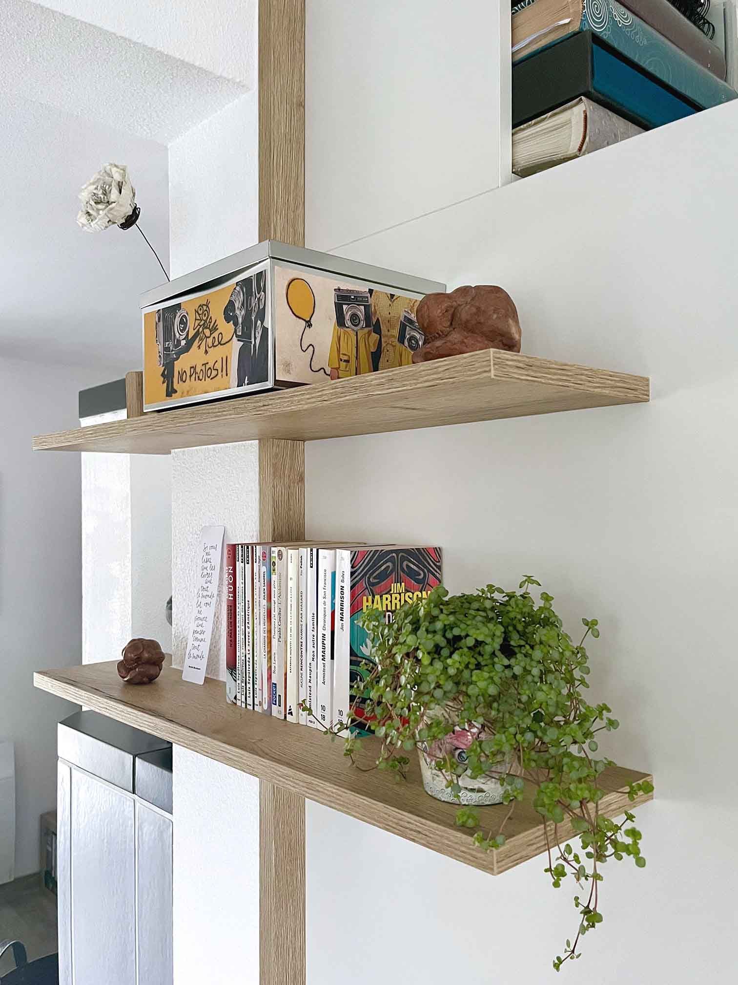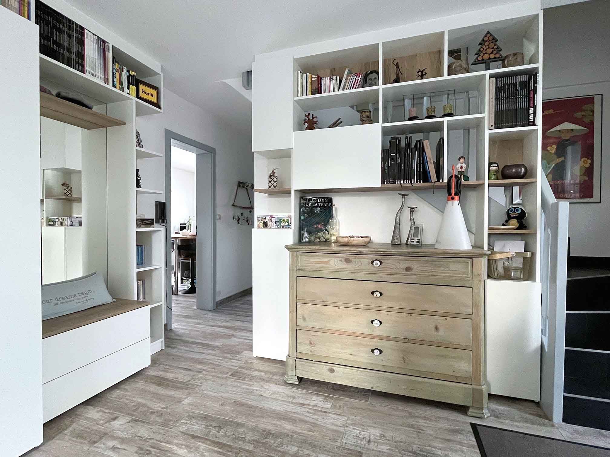 Ainsi, nous avons imaginé autour du meuble existant, un jeu de vide et de plein permettant le rangement de chaussures, de livres, d’objets du quotidien et d’éléments de décoration.