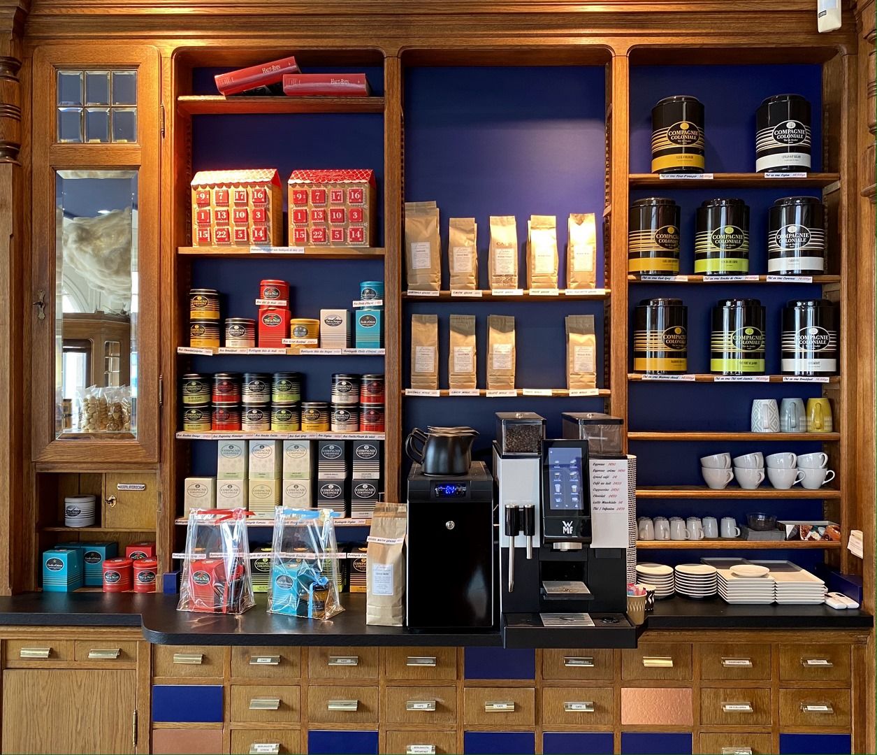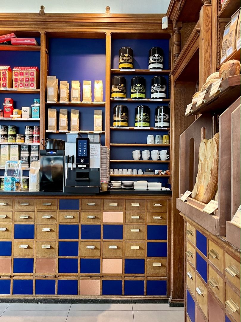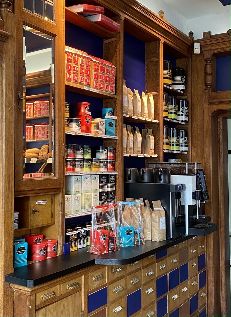 Changement total de destination pour cette ancienne pharmacie qui devient aujourd’hui un salon de thé et une épicerie fine où l’on trouve non seulement du pain frais et des bonnes viennoiseries mais aussi toutes sortes de produits gourmands pour se faire plaisir ou pour offrir.