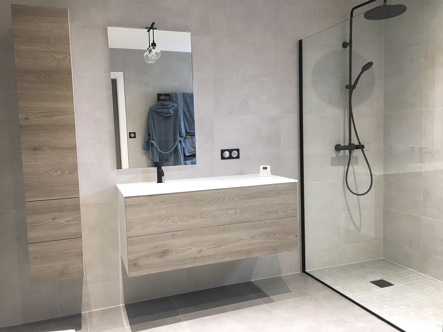 Cette spacieuse salle d’eau a retrouvé une nouvelle jeunesse avec un style épuré, des lignes droites et des coloris neutres qui nous plongent dans un univers contemporain, presque masculin.