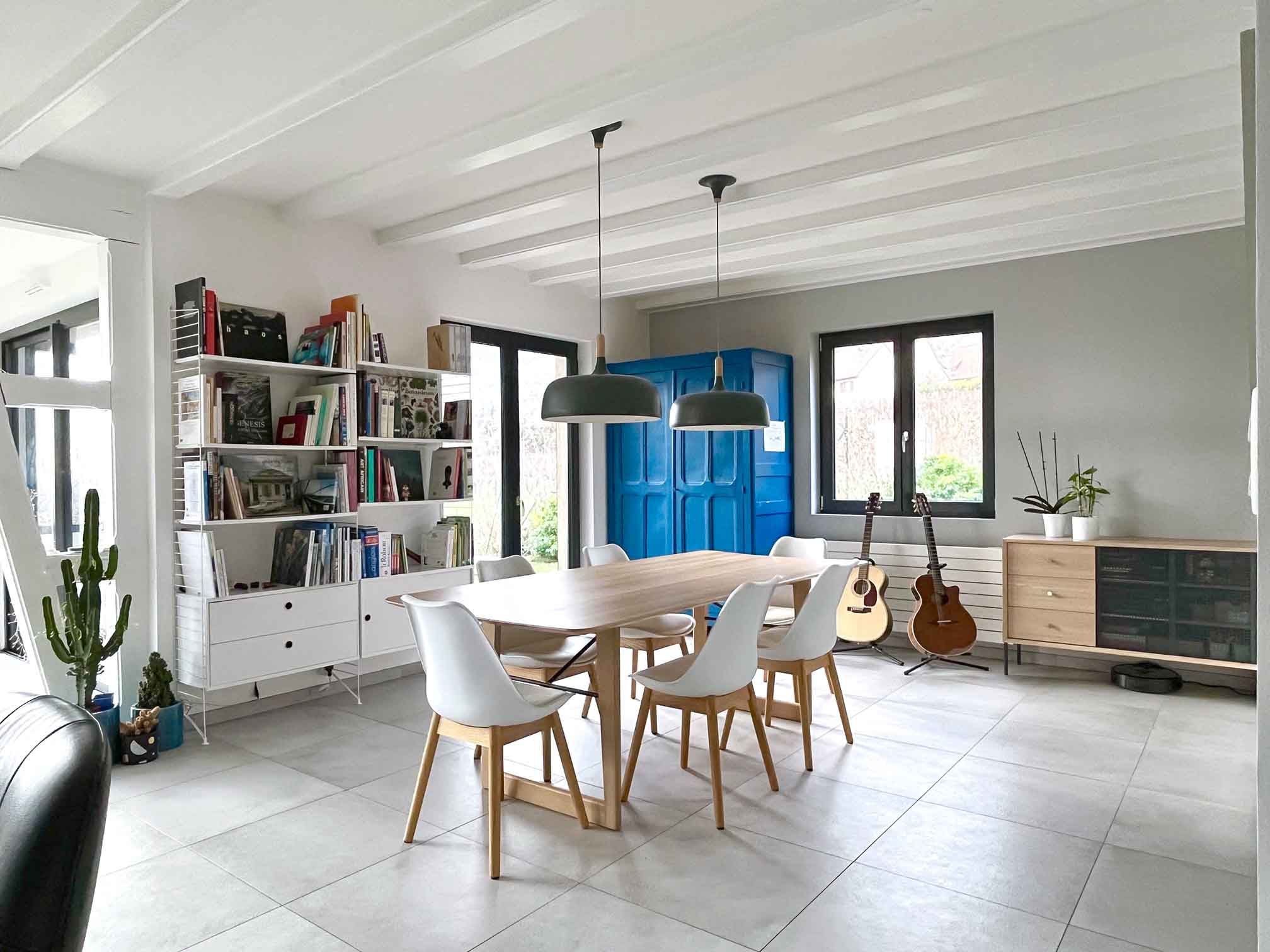 Ainsi, nous avons chamboulé l’espace en déplaçant la cuisine, en implantant une suite parentale au rez-de-chaussée, en re-dessinant l’entrée…